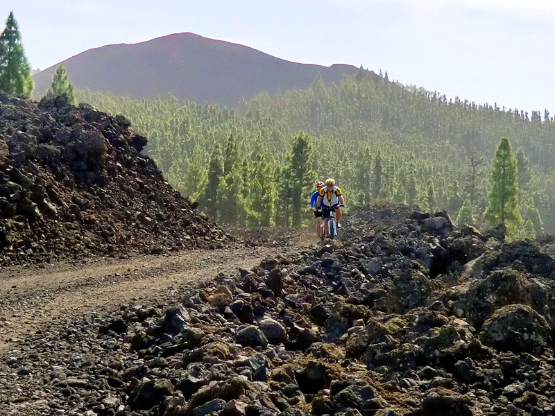 Rondom de Chinyero-vulkaan rijden we over de typische vulkanische top door de zwarte rivieren van lava en dennenbossen.