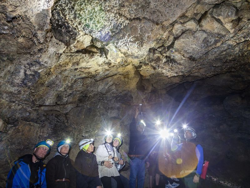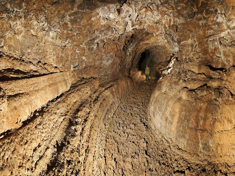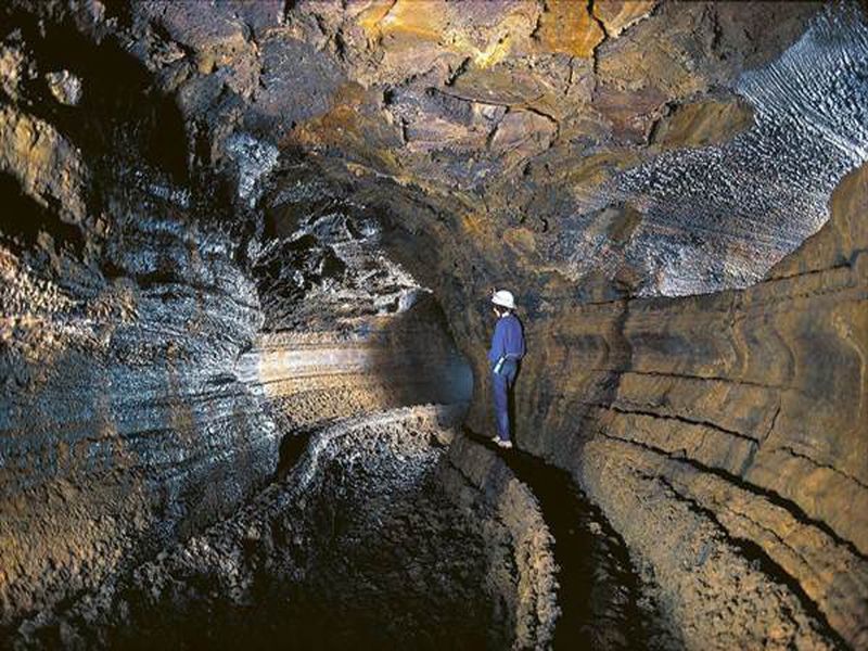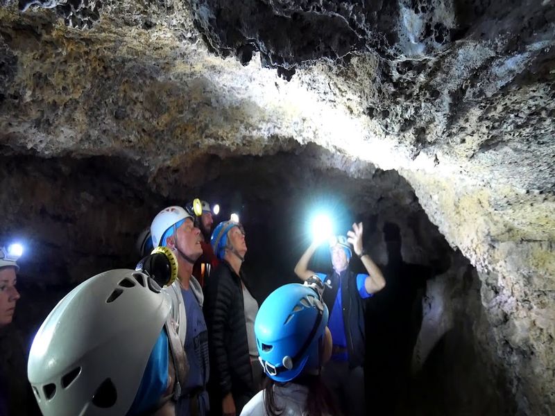 We stellen onszelf in als echte speleologen en bereiden ons voor om de buis te betreden. Na deze geweldige ervaring maken we een wandeling door de muren van een vulkanisch kanaal, genieten we van de flora en een prachtig uitzicht op de omgeving.